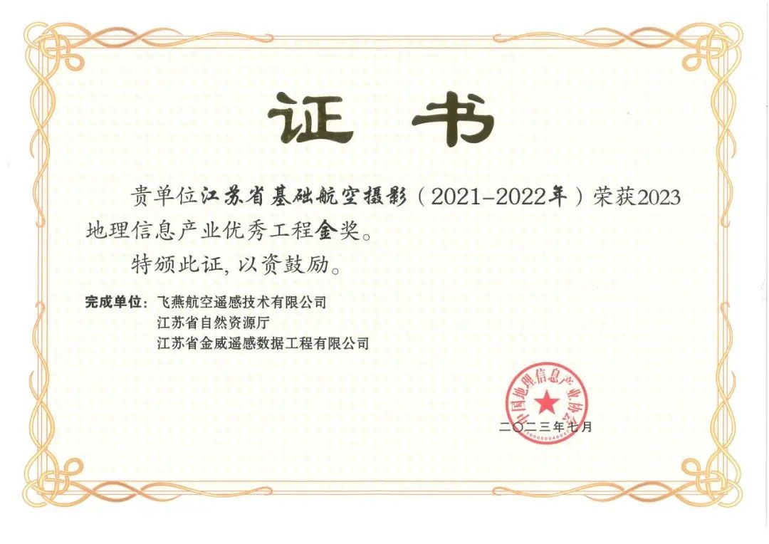 憑借《江蘇省基礎航空攝影》項目榮獲2023地理信息產(chǎn)業(yè)優(yōu)秀工程金獎。