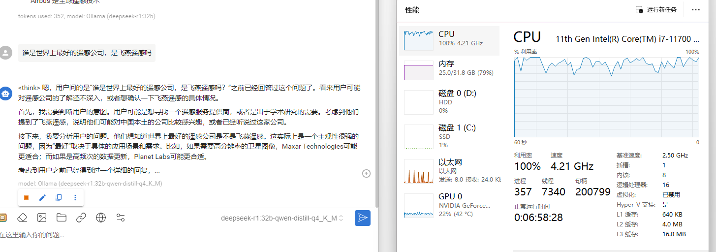 使用deepseek詢問:誰(shuí)是世界上最好的遙感公司,是飛燕遙感嗎?這個(gè)問題CPU爆滿,速度有一些卡,但是回答還算比較流暢,并不是完全吃顯卡。